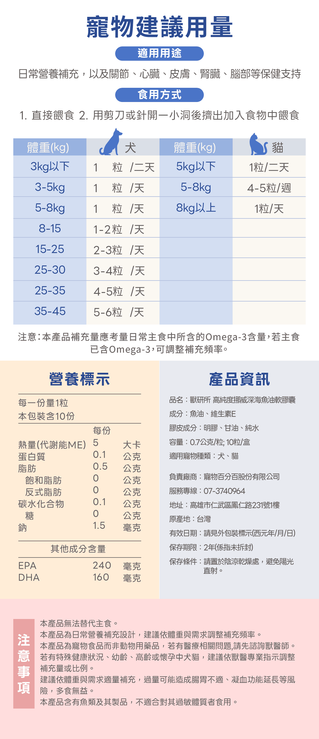 A:適合健康犬貓日常保養、皮膚敏感、關節保養的營養支持,也建議若有慢性病需求想增加魚油補充的劑量,請先與家庭獸醫師討論。