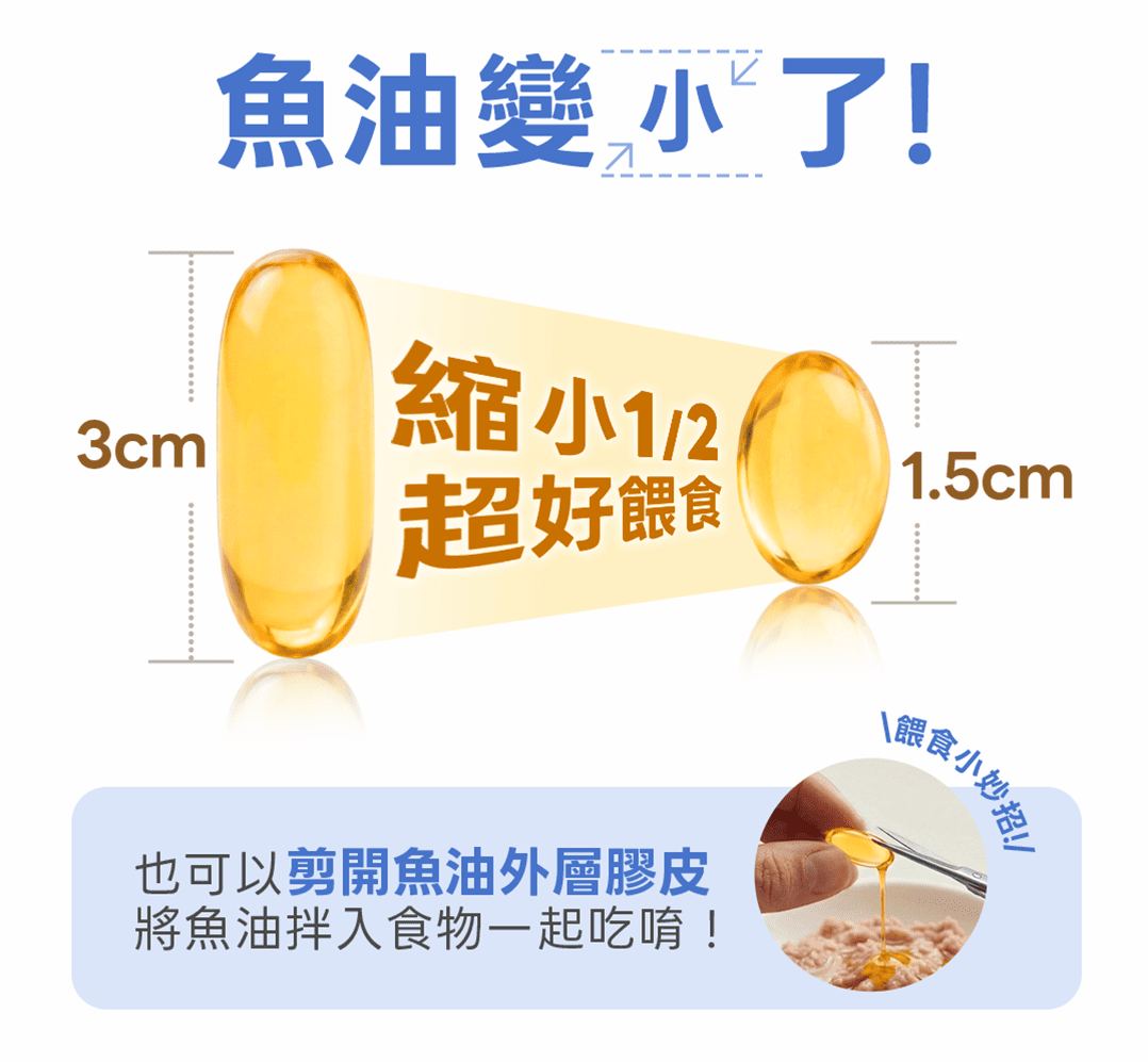 A:在建議劑量下服用,多數犬貓耐受性高,但若是初次補充魚油,則部分毛孩因脂肪攝取增加,腸胃需要適應,可能出現短暫軟便,為常見的過渡反應,建議可以搭配主食一起餵食,幫助吸收,通常可隨時間改善。但若出現持續腹瀉、嘔吐或精神食慾下降,建議先暫停使用,並由獸醫師進一步評估是否有其他健康問題。