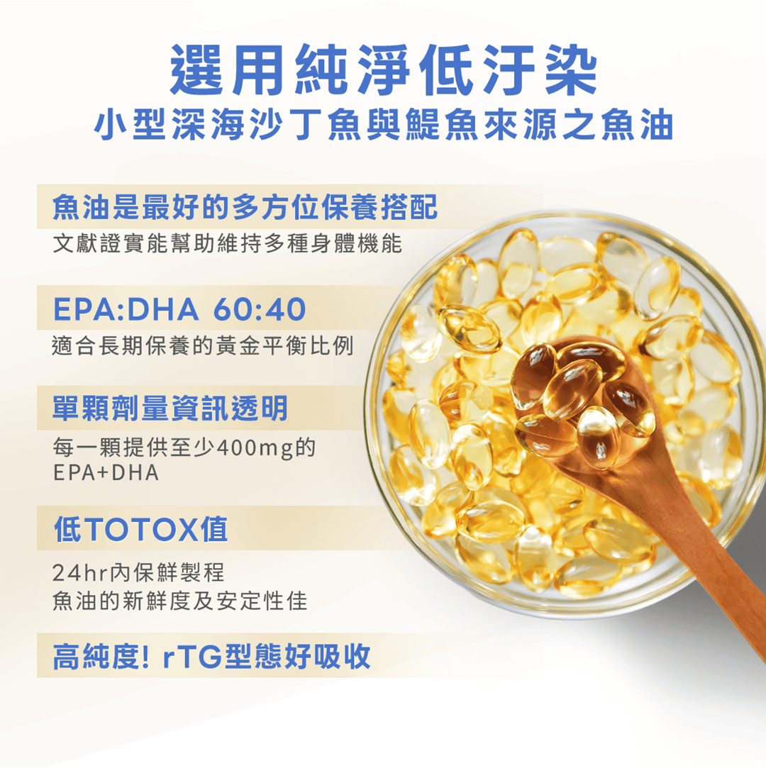A:選用低汙染深海魚種,採用rTG型高純度魚油,吸收利用率佳。每顆提供400mg EPA+DHA,並以EPA : DHA = 60 : 40的黃金平衡比例設計,適合長期日常保養使用。搭配PTP單顆密封與鋁箔袋避光包裝,有效降低氧化風險,維持品質穩定。