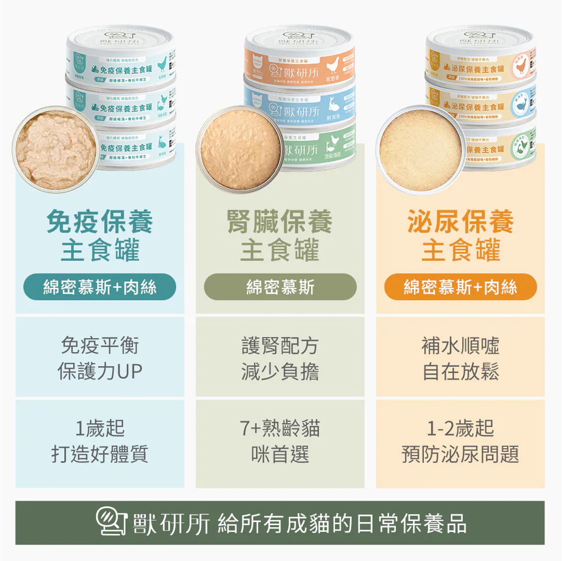 每個階段都有不同的照護焦點。幼貓時期要預防感染與腸胃問題,成貓重點在體態與泌尿健康,老貓則需提早預防腎臟病與關節退化。三款獸研所主食罐正好能對應這些需求: