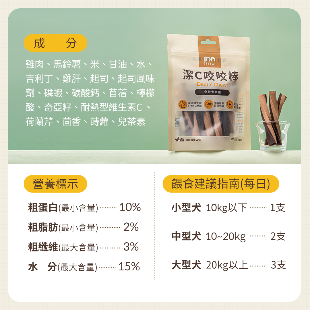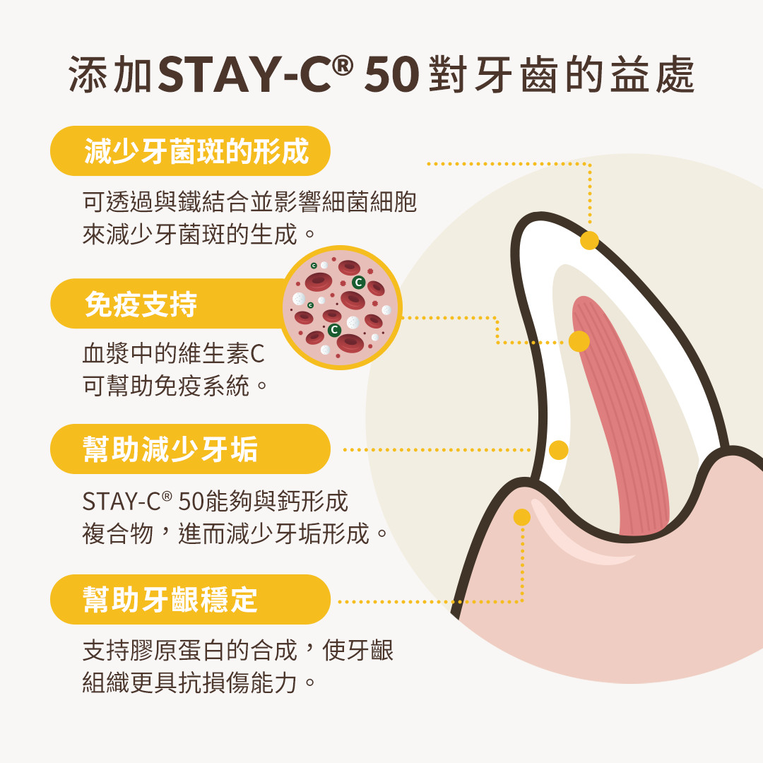 - 專利維生素STAY-C®添加 幫助減少牙菌斑、牙結石產生