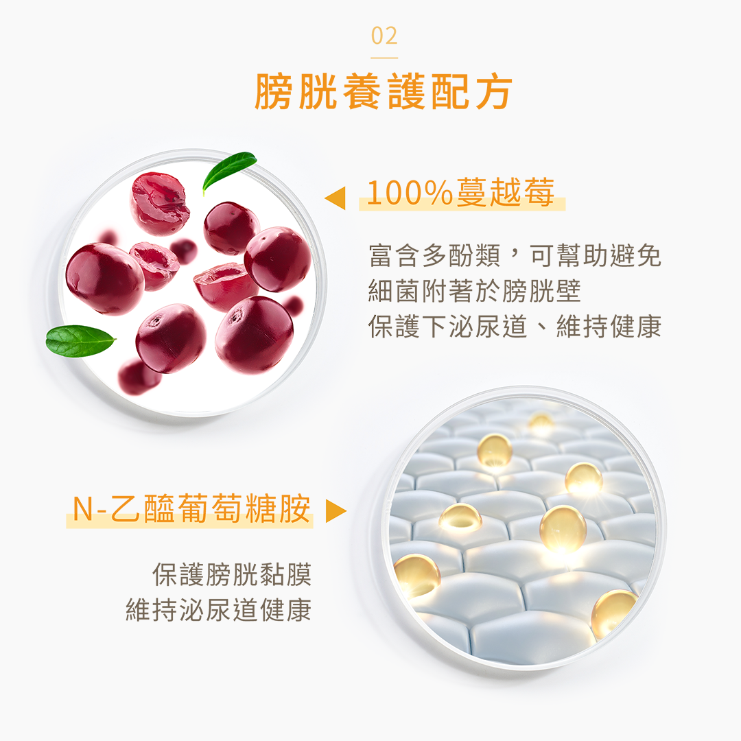 ✓ 有機蔓越莓&N-乙醯葡萄糖胺,保護膀胱黏膜
